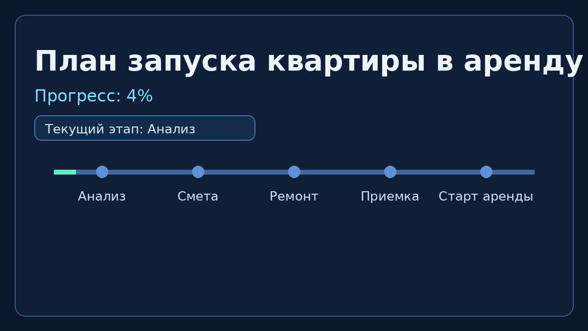 - 4) Параллелить ремонт и закупки, чтобы не терять недели на поставках.